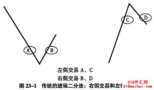 参见图23-1。 市场下降时,a点一般是左侧介入位置,也就是说市场多在没有完全企业稳定的迹象时介入,这很危险,在某些方面类似于预见交易,但不一定。 这个需求出来之后需要自己理解。 实际上,估价交易的入场可以是a点也可以是b点,所以从这个角度来看,左侧交易和右侧交易实际上只不过是估价交易入场的两种细分方式。 市场呈上升趋势,如果趋势向下(无论从哪个角度来看,市场召回都不值得去交易),可以选择在c点介入,还是在d点介入,c点是左侧交易,d点是右侧交易。 左侧交易和右侧交易基本上是交易,或者在市场不稳定时反方向干预(不是相反),或者在市场变得稳定反方向时,或者正方向干预(主观上觉得和方向一致),右侧交易。