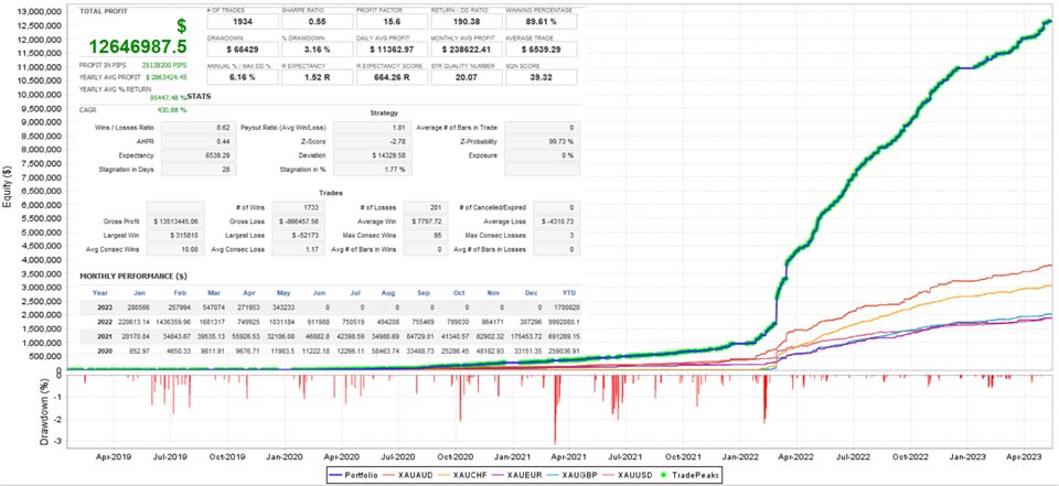 每笔交易都有固定的止损和虚拟利润跟踪。该系统在一个 XAUUSD H1 图表上运行。