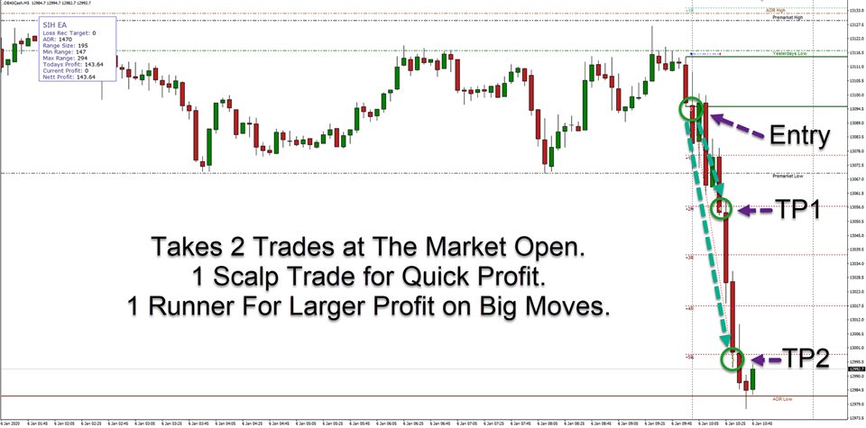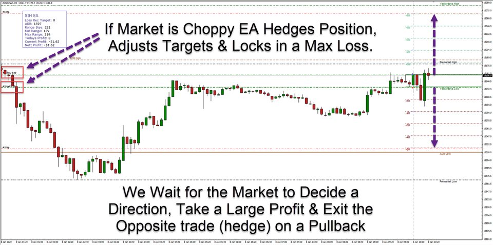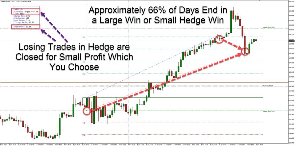 EA 在开盘时进行 2 笔交易,如果成功,EA 会按照您选择的 R:R 比率在第一笔交易中获利,然后保护第二笔交易,同时尝试让交易者从趋势日中受益。 如果盘前范围太小,它将使用开盘时的第一个 5 分钟蜡烛重复该过程,并重复分析该范围的过程,以确保其不会太大或太小而无法进行交易。 如果开盘波动且市场未产生彻底突破,EA 将对冲头寸并尝试在交易日晚些时候退出,此时价格通过退出一个方向的交易来决定方向,然后等待回调以错误退出。 定位交易,赚取微薄利润。