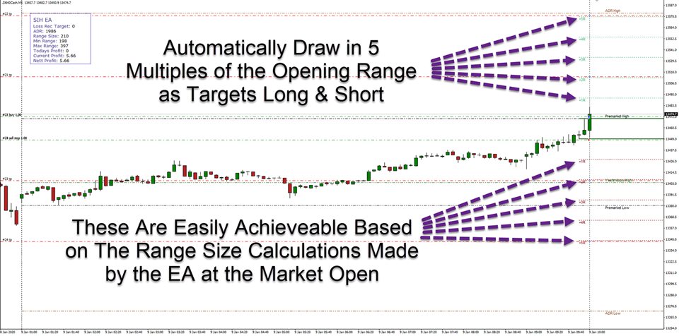 特征:自动计算盘前范围和初始开盘范围,以找到最佳交易范围大小,防止不太可能成功的交易。对冲头寸以锁定区间波动期间的损失,从而提供在支撑位和阻力位反弹时退出的机会。自动调整目标和止损以锁定利润、最小化风险并让市场喘息。按账户或固定手数的百分比定义风险。自动绘制关键盘中和日线水平,以便根据需要手动调整目标。信息显示面板显示正在交易的工具的当前和关闭利润。