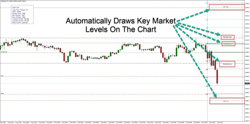 EA 可以全自动使用,并会尝试在大幅移动到第二个 TP 目标时退出,但一旦方向确定,识别日内良好的支撑位和阻力位可以使交易者能够更成功地阅读价格走势和 找到合适的水平退出。 市场经常从每日水平反弹,或者在所交易指数的平均每日范围内耗尽,因此这些水平会自动绘制在图表上,这样您就可以轻松地确定价格在反弹之前可能走向的方向。