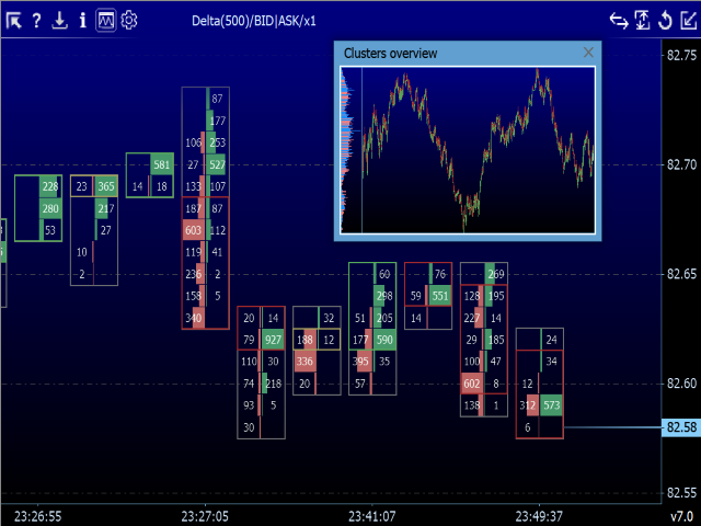 - "BID x ASK" - display the ASK and BID volumes separately, the ASK volume is drawn to the right, while the BID volume is drawn to the left of the cluster center.