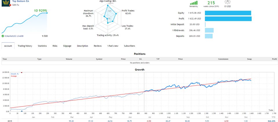 新上架EA活动价:$598元,每三天涨价 $ 100元,涨价过程: 398--> 498--> 598 ...... 涨到目标价 $ 4999为止。对盗版说不:不要拿自已的本金试错,由于TopBottomEA包含一种算法来检测所有假冒版本,之后的所有激活都将无法正常工作,请小心。挑战最小资金 真实账户1: https://www.mql5.com/zh/signals/1575208 质量【可靠性】5格,在新冠病毒期间,EA交易中断了一年,服务器因故过期。支持货币:GBPCAD ,EURSGD ,其它品种以后再陆续增加,大家目的是为了赚钱,只选最优,货币不在多在精,让收益更稳定。支持周期:M1图表平台推荐:官网真实账户用的是icmarkets平台原始点差账户,听客户说 icmarkets平台 标准账户类型效果更好,具体大家去测试。exness平台零点账户也可以,更多的其它平台都可以去测试。仓位建议:对于回撤敏感的朋友建议 1000的仓位两个货币分别挂0.03手; 对于回撤不敏感的朋友,建议 1000仓位两个货币分别挂0.05手。使用方法:分别加载到GBPCAD和EURSGD,1M图表中,不需要调任何参数,只需跟据仓位建议调手数即可。风险提示:请严格照上列推荐和建议使用EA,如果私自变动货币品种,或不按建议调整仓位手数的,风险自负。竖立正确的使用EA心态和理念:1,是否有单由行情决定,也许一天一单都没有,也许一天顶几天的单量,行情越大单量越多。2,一款完美的EA曲线往往是上上下下来回波动成长起来的。只有马丁类策略曲线是直线,但随时会归零。3,不要对交易抱着急功近利的心态,一款好EA并非每天都有盈利,每个EA都有它特定最合适的行情,在80%不合适的行情中可能是盈亏持平或小盈,在 20% 合适的行情中可能是快速拉升式盈利, 耐不住80%的磨难,就没有20%快速拉升收益。4,本着稳健投资心态,在稳健的前提下,追求合理的长期稳定回报;反对靠运气,不设止损,死扛等,背后潜藏巨大风险;用止损换取盈利,在不断止损和止盈中博取稳定长期的收益。5,手工操盘需要心态,使用EA同样需要好心态, 使用EA就如种菜,关注得越频繁越不见成长,因为你在慢慢体会这个时间过程,总认为太慢。当你不在意时不知不觉中成长很高了,请竖立正确的投资心态,不要浮燥。6,慢=快 :是指当EA框架在 【一次只下一单,严格止损】的约束条件下,能稳住成长,就说明风险是可控的,即慢等于快。7,快=爆仓 :是指当EA框架在【不设止损,死扛单】的宽松条件下,就说明风险是不可控的,即快等于 爆仓 。