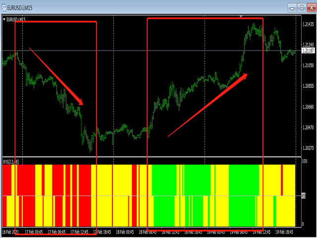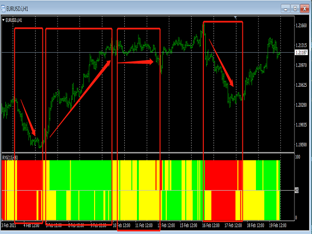 从黄色转变为绿色时,行情可能从震荡转变为上升趋势。一段连续的绿色,说明上升趋势很强。