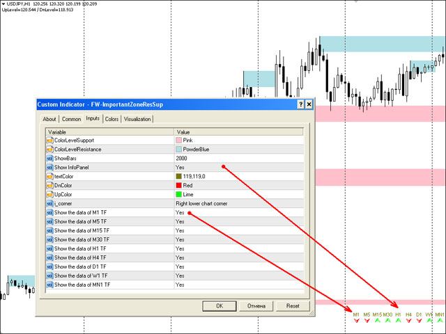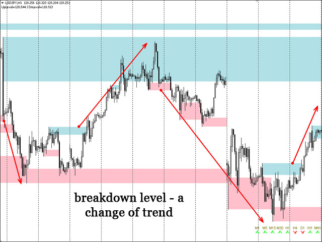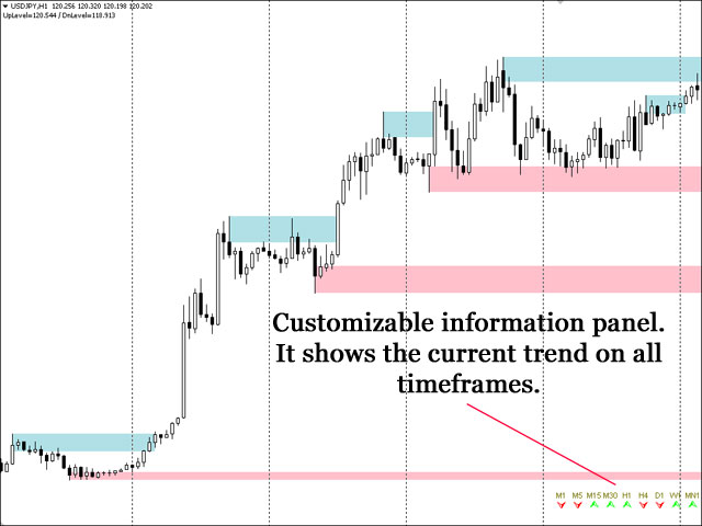 The data panel allows you to track the current trends on all timeframes. The current timeframe's important level values are shown in the comments.
