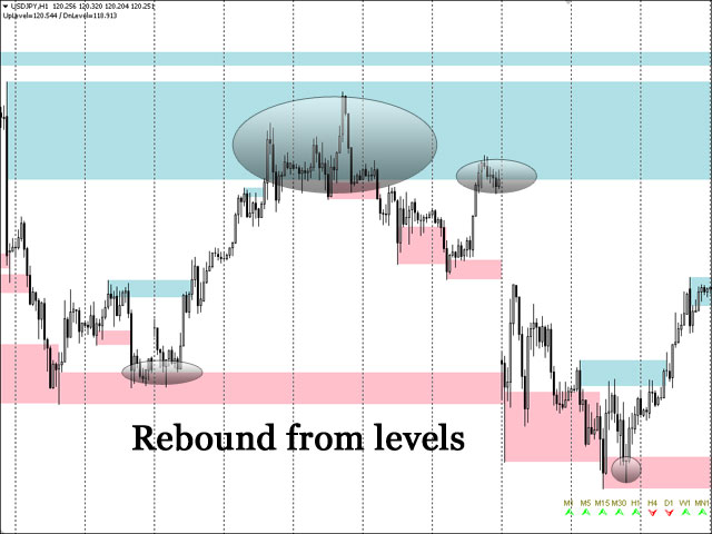 The Important Zone ResSup indicator displays important price support and resistance levels on the chart. The breakthrough or bounce from those levels shows further price direction.