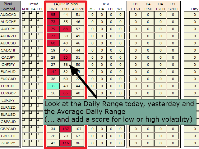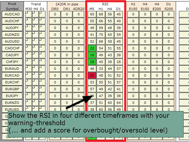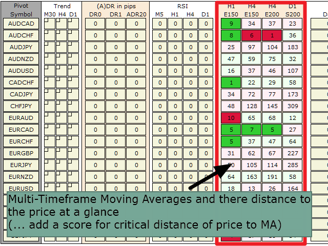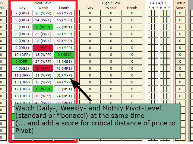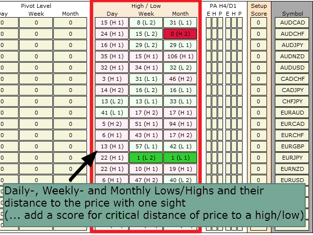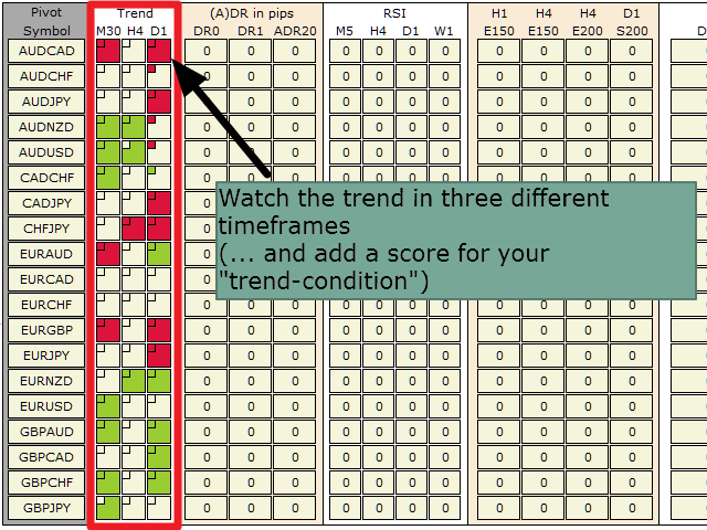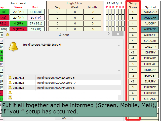 With the SR Dashboard, you get a powerful tool to control some of the most important information in trading. Assemble a setup according to your strategy and get informed as soon as this setup is valid. Assign scores to defined conditions and let the Dashboard find them. Choose from Trend, Average Daily Range, RSI, Moving Averages, Pivot (Daily, Weekly, Monthly), Highs and Lows, Candlestick Patterns.