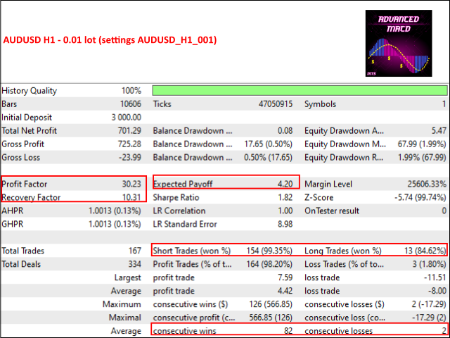 Advanced MACD EA is verified on both platforms (MT4 and MT5) and successfully passed tests and simulations with 100 % real ticks in MT5 with variable spread and simulated execution delays as well as with 99.90 % real ticks in MT4 with variable spread.