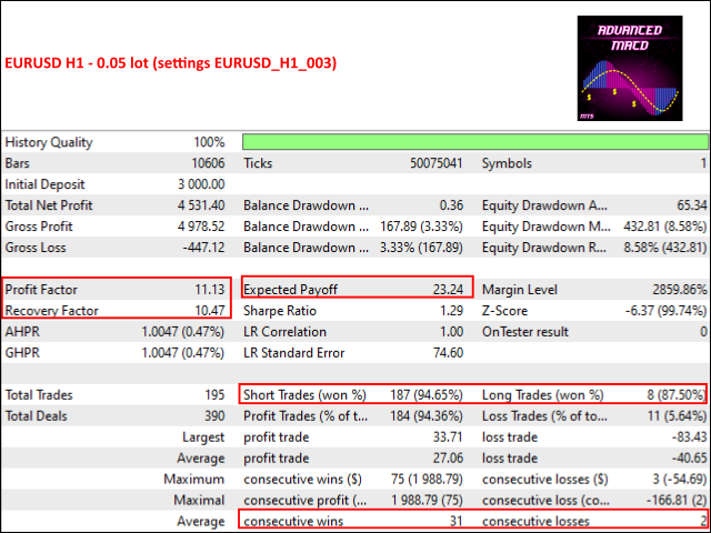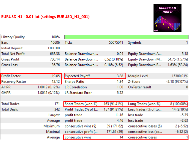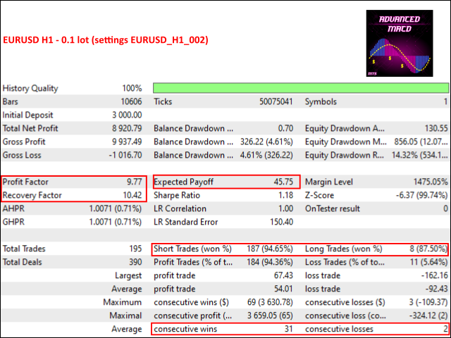 Advanced MACD EA default settings is optimized for EURUSD H1.