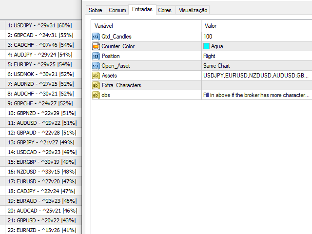 ATENTION: Demo on the estrategy tester is not functional to show other assets, but still can show how the indicator works! Use one or two candles on the configuration to see how the percentage change on the chart!