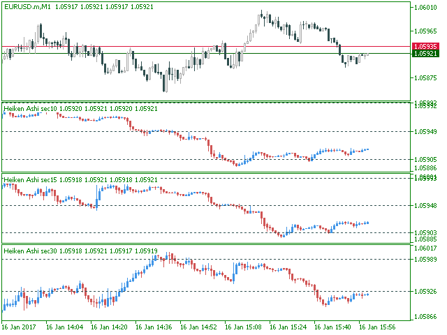 The indicator displays in a separate window a price chart as Heiken Ashi candlesticks with a periodicity below a minute.