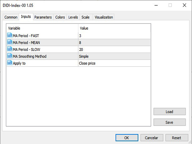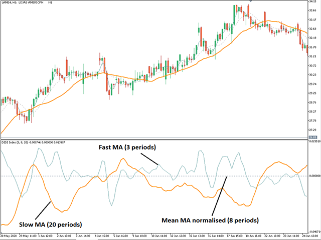 The Didi Index Indicator is built from these 3 moving averages. The central (8 periods) is normalized, staying flat on the chart the whole time, and the other 2 are divided by it, thus creating a crossing relationship between the averages, with a "leveled" base from the central average.