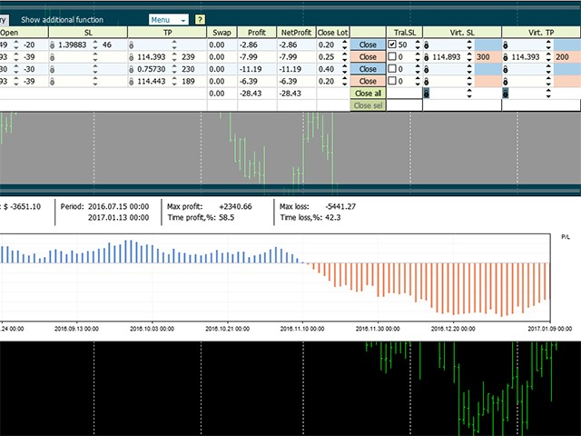 Activated by clicking the "Show additional function" command in the title bar. Provides access to functions: trailing stop (TralSL)– distance in points with activation and virtual stops (VirtSL/VirtTP).Attention! Virtual stops and trailing are active functions of the panel. For them to work, the panel must be running on the chart and trading must be enabled.