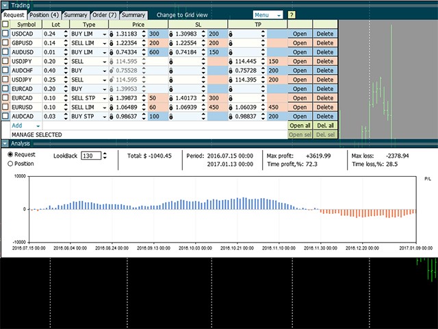 Another option for working with pending orders is presented in the form of Grid-mode. It can be accessed by clicking the "Change to grid" command. The list of pairs for this mode is formed separately from the Request mode.