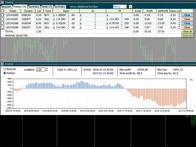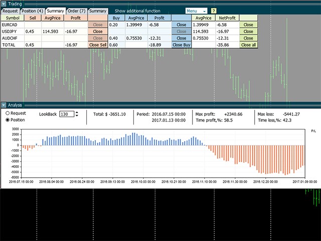 Orders are closed by pressing the "Close All", "Close" or "Close sell" button. It is also possible to change the number of closed lots in the "CloseLot: column.