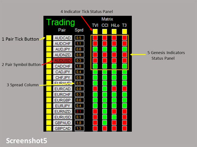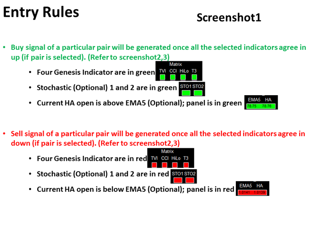 - Monitor all 28 pairs and provide trading signals based on the Genesis Matrix Trading rules (see screenshot 1, 2, and 3).