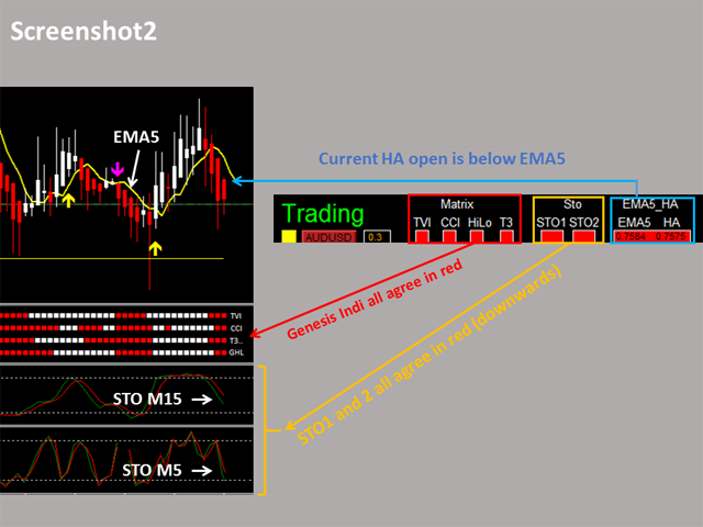 This system basically utilizes Genesis Indi Set (TVI, CCI, GannHilo, and T3) as the core indicators to generate trading signal mainly on time-frame M15. The signal will be further filtered and trimmed by 1) M5 and M15 Stochastic; 2) EMA5 and HA