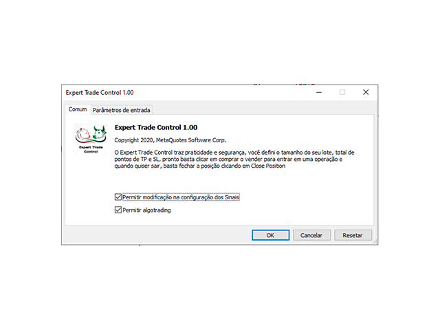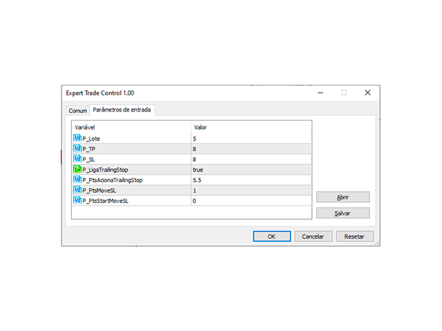 Note: You must pay attention to the number of points in SL and TP, as it differs according to the asset. For example, the USATEC asset oscillates from 1.0 in 1.0 points, which is equivalent to 100 points. The Expert Trade Control, must be configured with 1.0 points, if you want to have a SL or TP of 100 points.