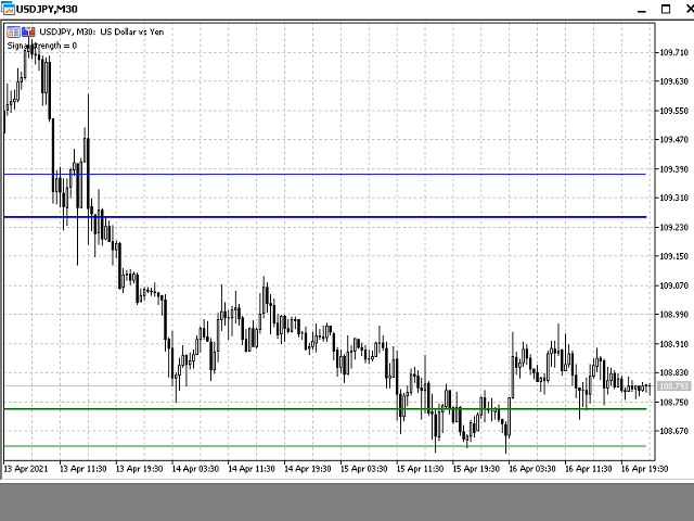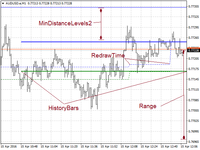 The smaller the timeframe, and the larger the HistoryBars parameter, the stronger the levels will be. When used on 4-digit accounts, it is better to decrease the Range and MinDistanceLevels2 parameters. The indicator is best used on small timeframes (M1, M5, M15, M30), but it can also be used on larger ones.