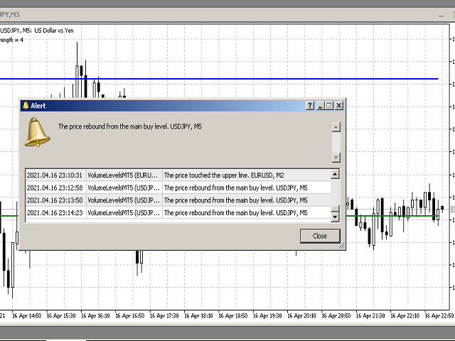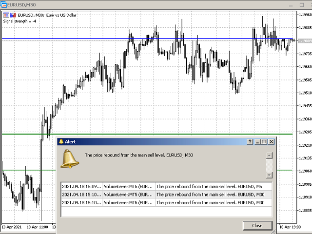 . At such levels, the majority of transactions were made. In the future, the price often bounces off such levels, and this can be successfully applied in trading. This indicator is able to determine the levels at which there was the most volume over the specified period of history. These levels are shown as lines, and the parameters for determining the levels are configurable. In addition to displaying, this indicator can inform the user when the price touches the level, or repels from it. It can work on any currency pairs and timeframes.