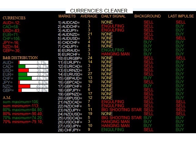 It uses a complex algorithm to study the movement of 17 different indicators. It means that the algorithm not only "reads" the actual value of an indicator, but also creates a probability of success using the position of this value on the indicator and the last movement of the same indicator. After doing this (for each one of the indicators), the algorithm will study the smaller timeframes of the markets, measuring how many times a market has broken the volatility of the indicator on top and on the bottom. The final part consists in isolating the markets of a particular currency and gathering all the probabilities studied before, giving us a numerical results.