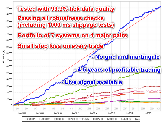 This EA is a professional portfolio of trend-following multicurrency trading systems based on principles of volatility breakout and breakouts of support/resistance levels. Consists of 7 strategies chosen from a pool of many other which I trade myself for a long time on real accounts with significant money on them