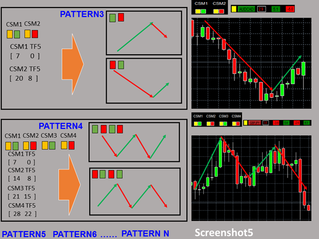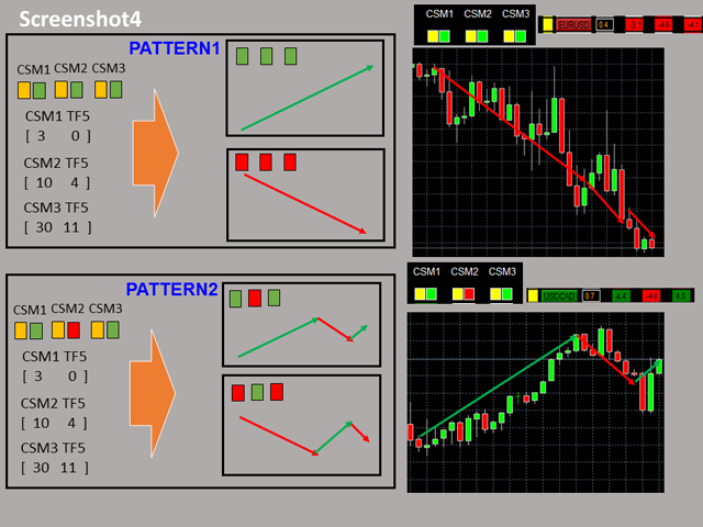 The Dashboard Currency Strength Meter Advanced gives you a quick visual guide to which currencies are strong, and which ones are weak over the customized 4 time-frames and period. With the combination of usage of the 4 Currency Strength Meters , you are able to monitor almost all kinds of price patterns (see screenshot 3, 4, and 5) and generate buy/sell signal based on the pattern you select.