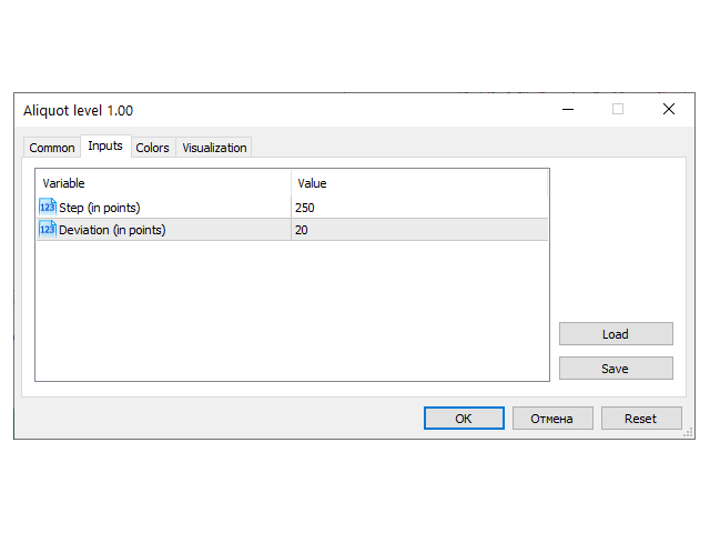 Example:Step - 500Deviation - 20If the symbol reaches the price for example 1.73500 + - 20, i.e. from 1.73480 to 1.73520, lines are being built. The next point will be at another level 1.73000 (from 1.72980 to 1.73020) or 1.74000 (from 1.73980 to 1.74020).