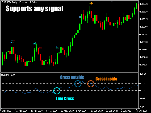 - 支持 大多数指标:线交叉、水平交叉、图表信号、颜色变化...