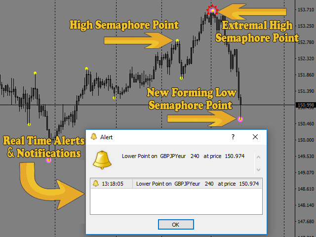 - The indicator places Semaphore points on the maximum and minimum of a higher, medium and lower period.