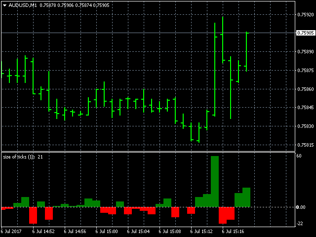 This indicator displays in a separate window the difference between the number of points which increased the price, and the number of points that decreased the price during the time interval specified in the settings.