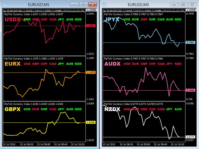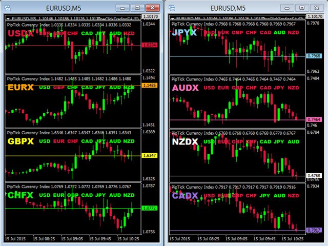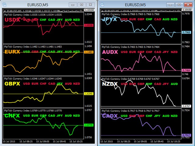 - The indicator shows the index of eight major currencies (USD, EUR, GBP, CHF, JPY, CAD, AUD, NZD).