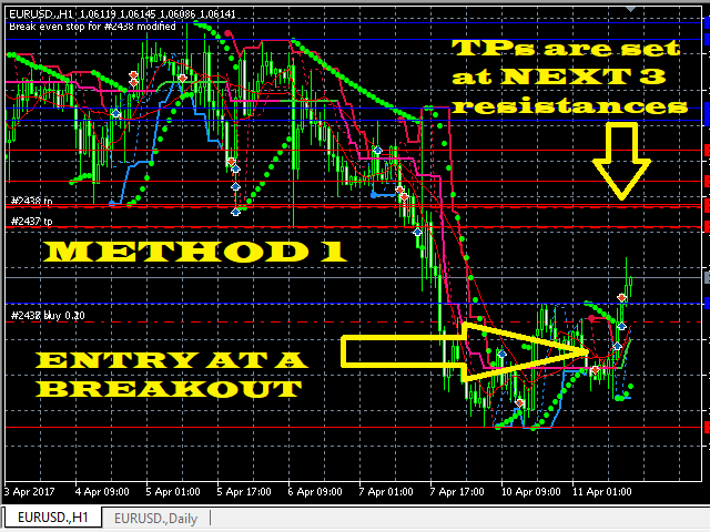 2. Nearest Support/Resistance. The EA would find the nearest resistance (in case of LONG) and nearest support (in case of SELL) for taking profits. TP1 would take place at the first resistance. TP2 at second and TP3 at third resistance.
