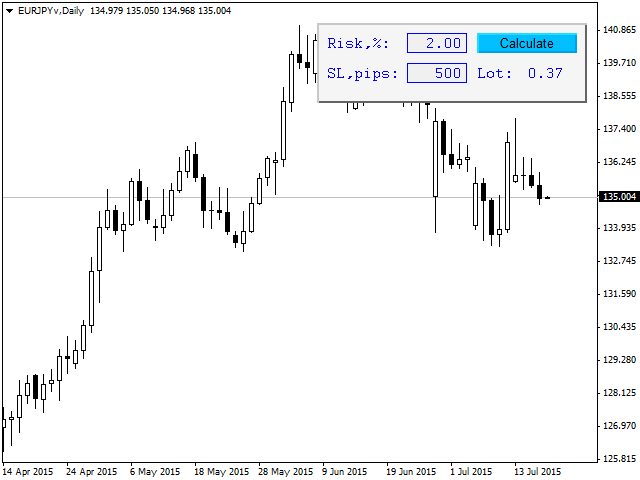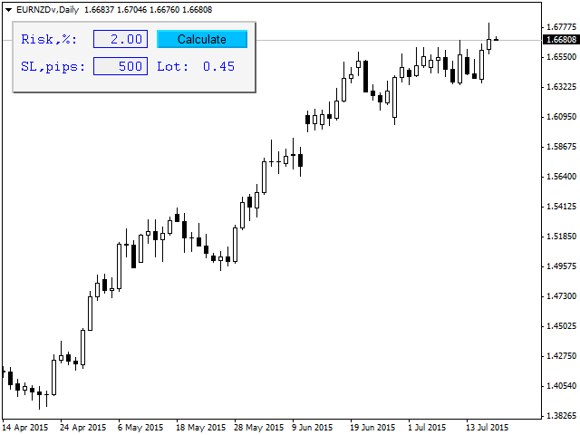 Lot Risk Calculator is a panel for order size calculation according to stop loss and allowed risk per trade. The calculation is performed for the symbol the indicator is launched at.
