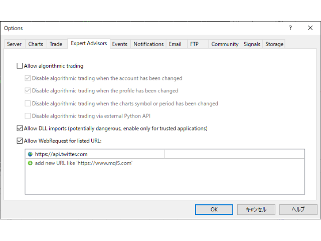 Tools > Options > Expert Advisors Allow WebRequest for listed URL:
