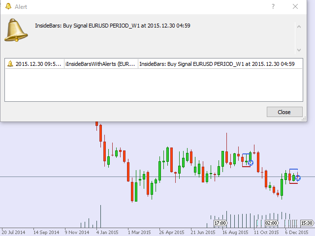 This indicator looks for the Price Action Inside bar pattern and places a signal pointer on the current bar, displays levels for the pending orders with the prices of the determining bar and alerts you when the pattern is identified.