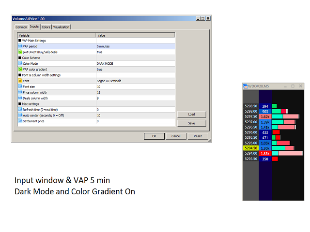using the same rules (bigger volumes = lighter colors). Also, shades of red will be used to paint (highlight) volume labels with the biggest accumulations.Font Font name Font size Font size Price label size size of Price label column (in characters) * Deals label size size of Deals label column (in characters) * Refresh time (0=real time) Time interval (in seconds) for the updating of the indicator. Used to save system resources, if needed.