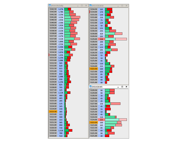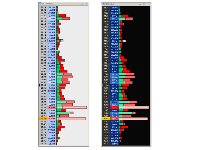 - horizontal bars are aligned to the price level and represent the cumulative volume traded at that price.