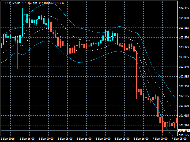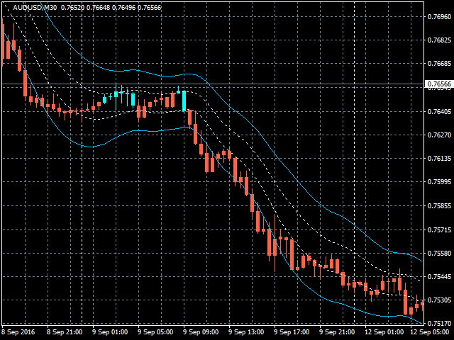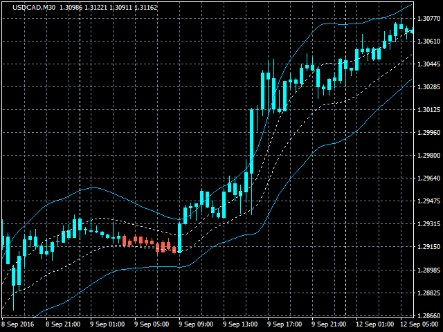如果是颜色是青色,即多头,等价格位于内层通道时开多,价格触及外层轨道则平仓。