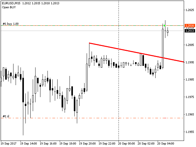 EA 中沿趋势线的交易以两种方式呈现:线突破交易和线反弹交易。当开盘价低于/高于趋势线且收盘价高于/低于趋势线时,交易信号是倒数第二根柱线(固定)。还使用未平仓头寸的标准尾随。