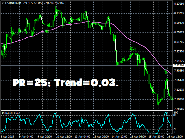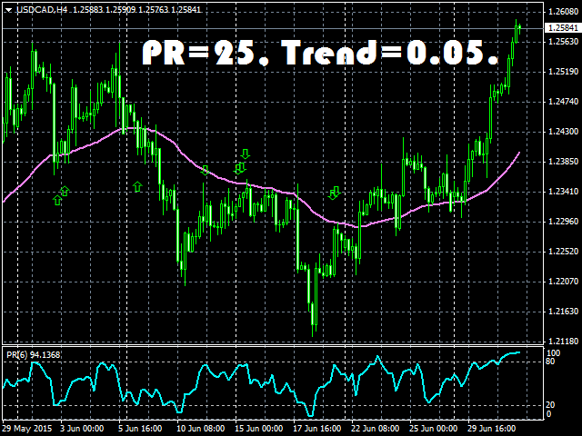 - PR – size of overbought/oversold areas of the Prise Reversal indicator. Default value is 25. If you decrease this value, the Trend Trade indicator will generate less signals but they will be more accurate. And vice versa for increasing.