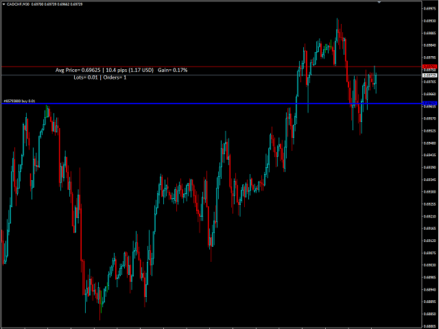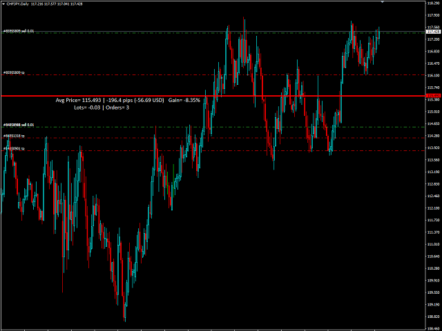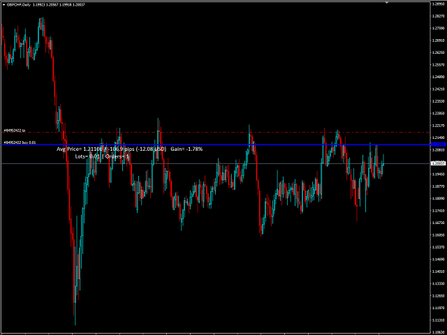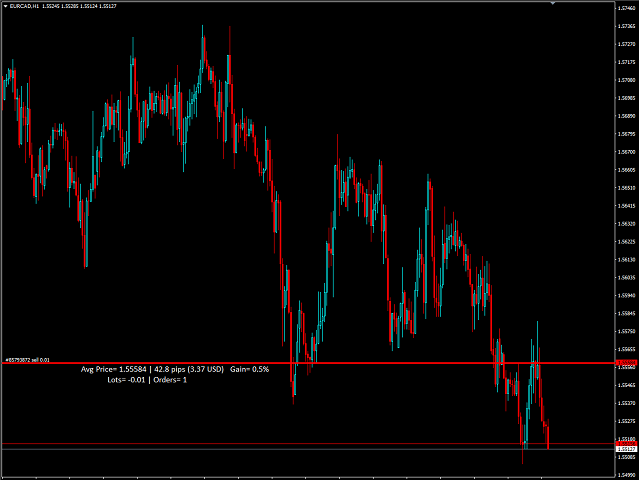 In addition to the average price, the indicator also shows you the number of pips and the financial value resulting from your open orders, the percentage gains, the number of lots in operation and the number of open orders.