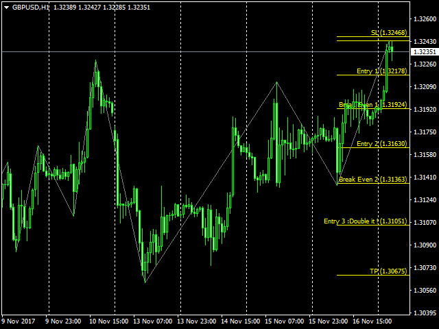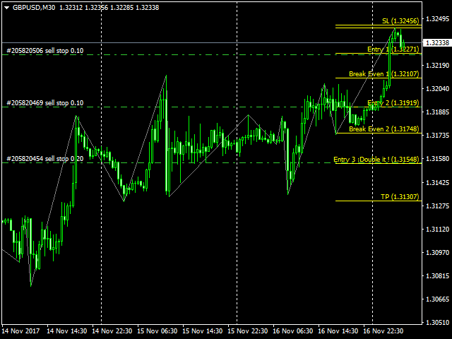 - Third entry for pyramiding at Entry 3, DOUBLE your lot with break-even risk, put all your stop-loss order at Break Even 2, move entry 1 and entry 2 stop-loss (trailing) to Break Even 2 level (Now all Stop-loss at Break Even 2 level).