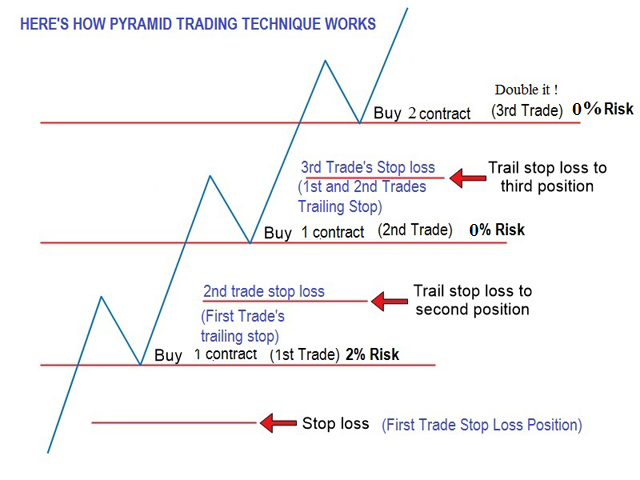 The pyramid forex trading strategy is a something every forex trader should know about because it makes the difference between making some pips with some risk in only one trade or some pips with less the risk by applying the pyramid trading technique. The basic concept of pyramiding into a position is that you add to the position as the market moves in your favor. Your stop loss moves up or down (depending on trade direction of course) to lock in position as you add lots / contracts. This is how you keep your overall risk while increasing your position size on the trade.