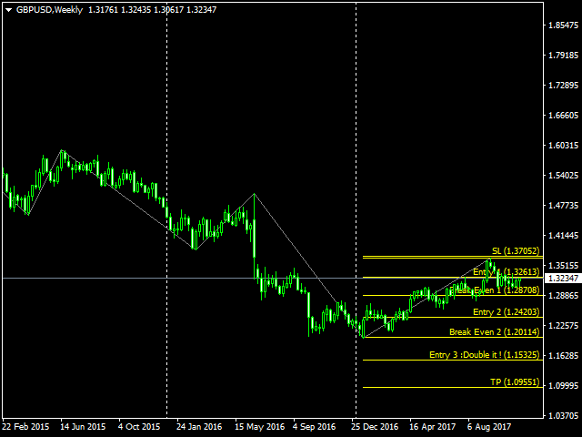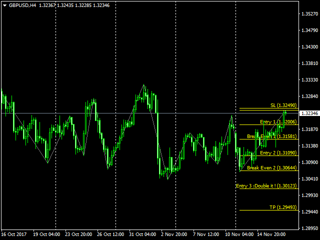 - Second entry for pyramiding at Entry 2 with the same lot as entry 1, put your stop-loss order at Break Even 1, and move entry 1 stop-loss (trailing) to Break Even 1 level (For now, Entry 1 and Entry 2 has the same Stop-loss at Break Even 1 level).