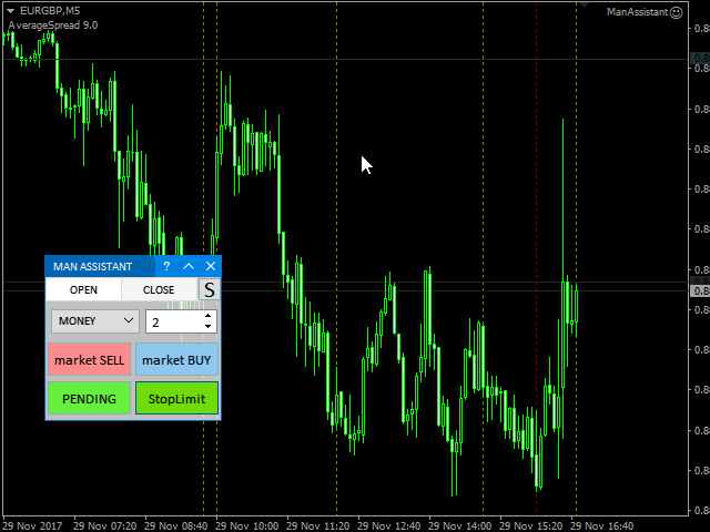 Everything is simple, you only need to specify the price of the order (or position by market) and stop loss. The type of the pending order is selected automatically depending on the logic of the relative location of the current price, pending order price and stop loss. Pending order is placed in 3 clicks (Stop Limit order in 4), position by market - in 2 clicks.