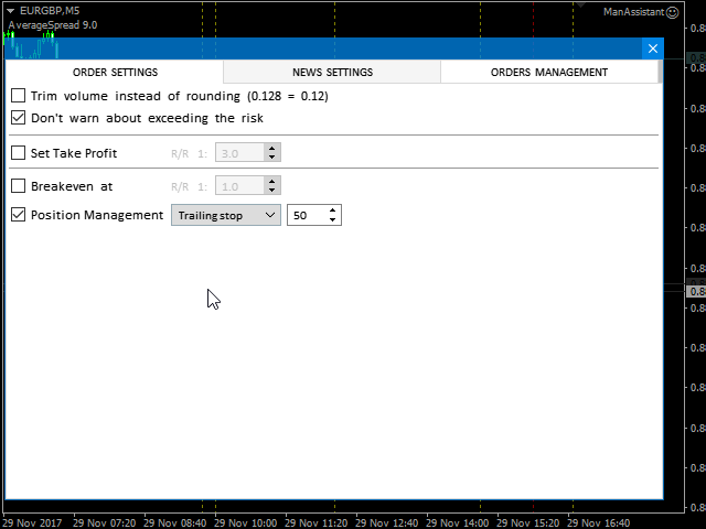 - Position management . The default management option can be set. If transferring to breakeven is selected for a position, the management starts working only after moving to breakeven!