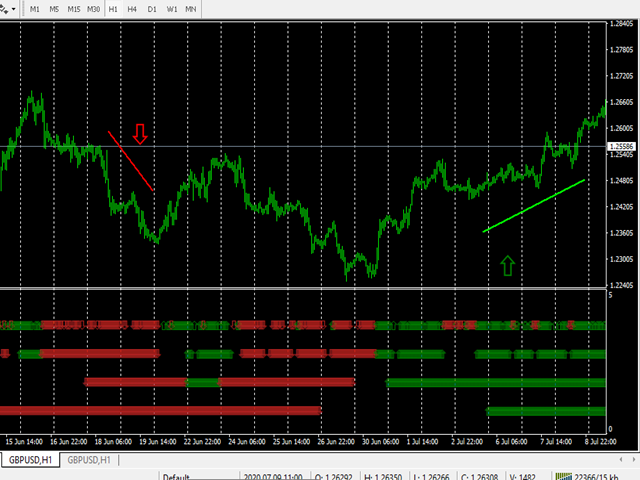 If there 4 green arrows in same vertical line that's mean (Up) and If there 4 Red arrows in same vertical line that's mean (Down)