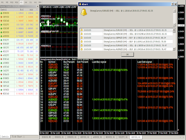 StrongCurrency是基于各种技术指标,移动平均线和枢轴的完整交易系统。这些元素中的每一个都可以通过定义的规则和系数进行评估(取决于指标),为StrongCurrency提供了无限优化的方案。StrongCurrency通过评估数据创建一个趋势强度和入场信号列表显示,它显示所有货币对的数据。根据每个货币对趋势强弱获得入场信号。列表数据包括Symbol,BuyPercent,SellPercent,LastBuySignal,LastSellSignal。其中LastBuySignal和LastSellSignal内容显示入场价格,时间,货币对趋势百分比。趋势强度大于70%时,认为是强货币对;该工具适用于外汇市场,指数,金属的数据。