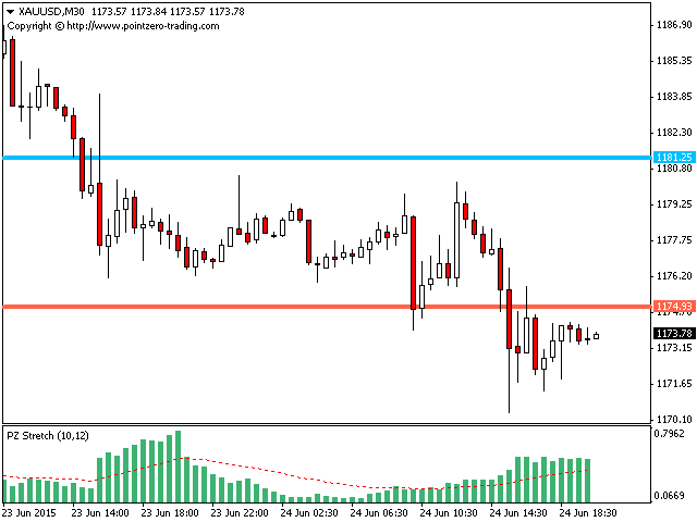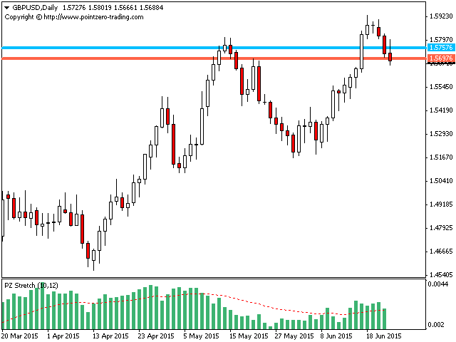 The Stretch is a Toby Crabel price pattern which represents the minimum average price movement/deviation from the open price during a period of time, and is used to calculate two breakout levels for every single trading day. It is calculated by taking the 10 period SMA of the absolute difference between the open and either the high or low, whichever difference is smaller. This value is used to calculate breakout thresholds for the current trading session, which are displayed in the indicator as two lines.